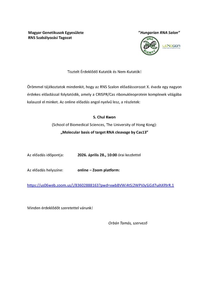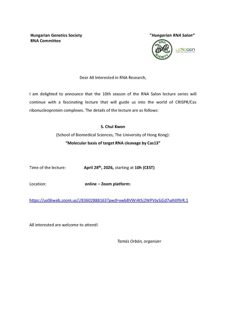 Örömmel tájékoztatok mindenkit, hogy az RNS Szalon előadássorozat X. évada egy nagyon érdekes előadással folytatódik, amely a CRISPR/Cas ribonukleoprotein komplexek világába kalauzol el minket. Az online előadás angol nyelvű lesz, a részletek: